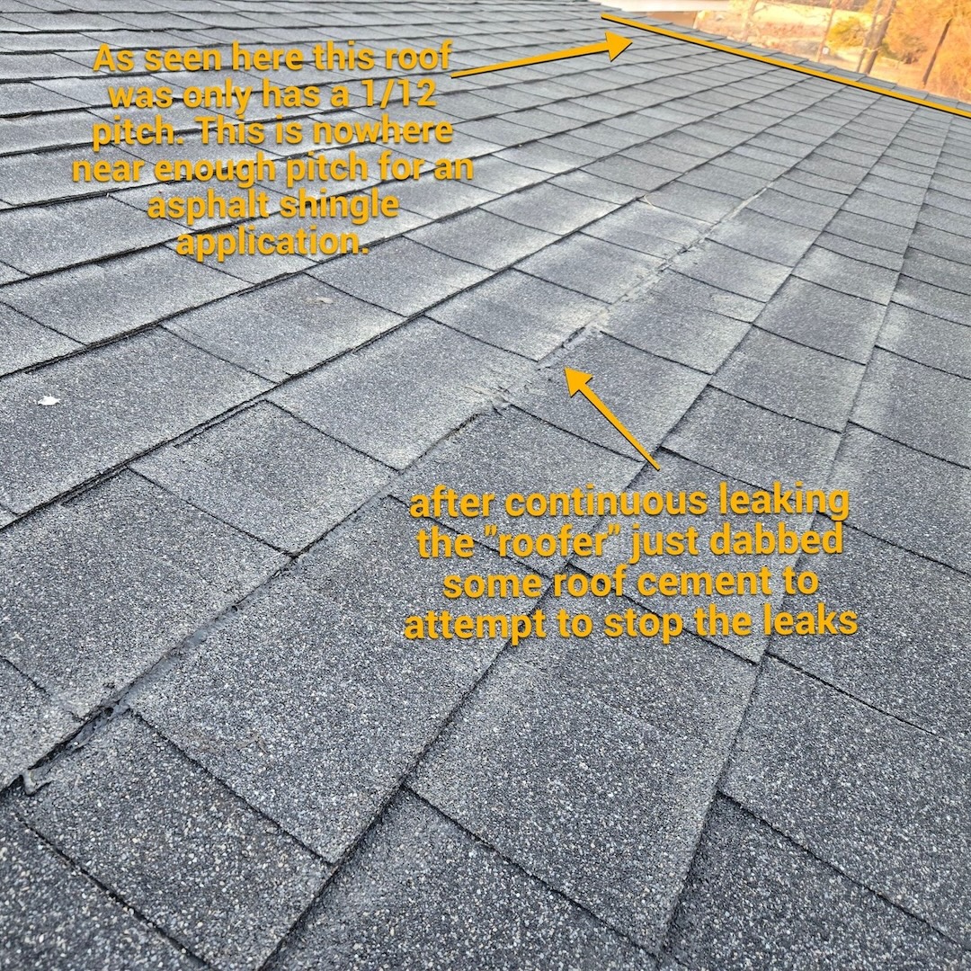 We inspected the roof the day after the homeowner contacted us and quickly identified the root of the issue. The porch roof had an extremely low slope of approximately 1/12, yet it had been installed with traditional asphalt shingles. Asphalt shingles are not designed to perform on roof pitches this low, which was the primary cause of the ongoing leaks. In addition, roof cement had been applied in an attempt to stop the leaks, but this was only acting as a temporary patch rather than a true solution.